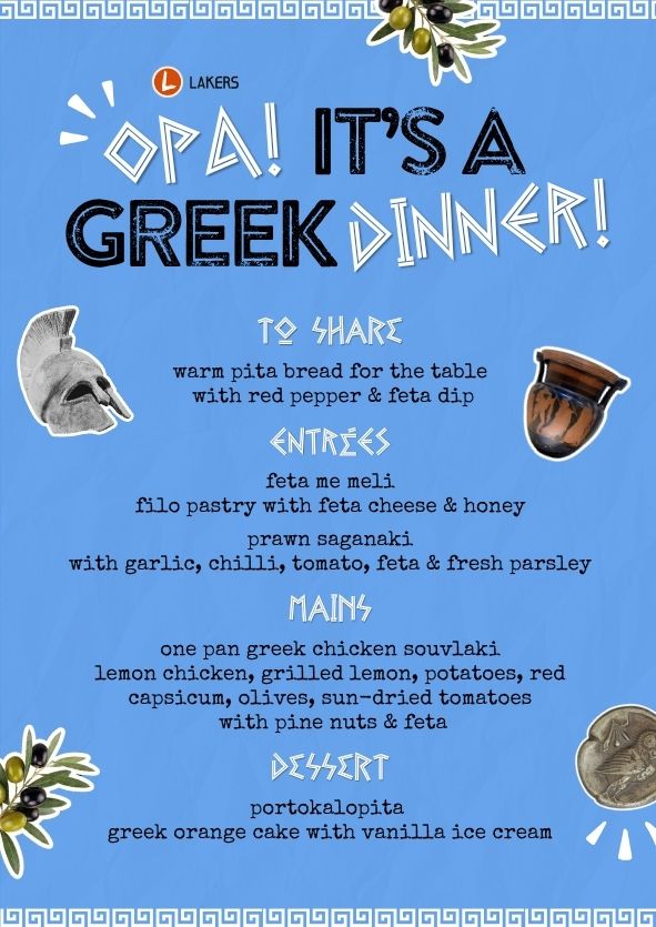 Dust off the toga, grab your crew and get ready for a night of Greek feasting at Lakers. Enjoy a 4-course inspired Greek dinner with 2hrs of free-flowing beers and wine. Plus, we'll have EPIC prizes for the best toga look on the night... or Greek inspired fit!