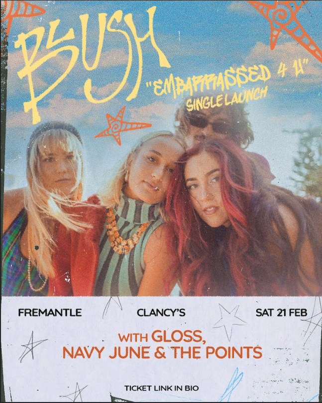Fresh off their debut National Tour, and keen as ever to celebrate their second single ‘Embarrassed 4 U’, Boorloo’s girly-grunge 4-piece, Blush, return to the stage at Clancy’s Fremantle on the 21st of February.